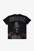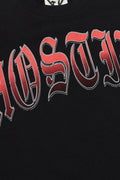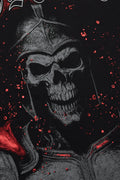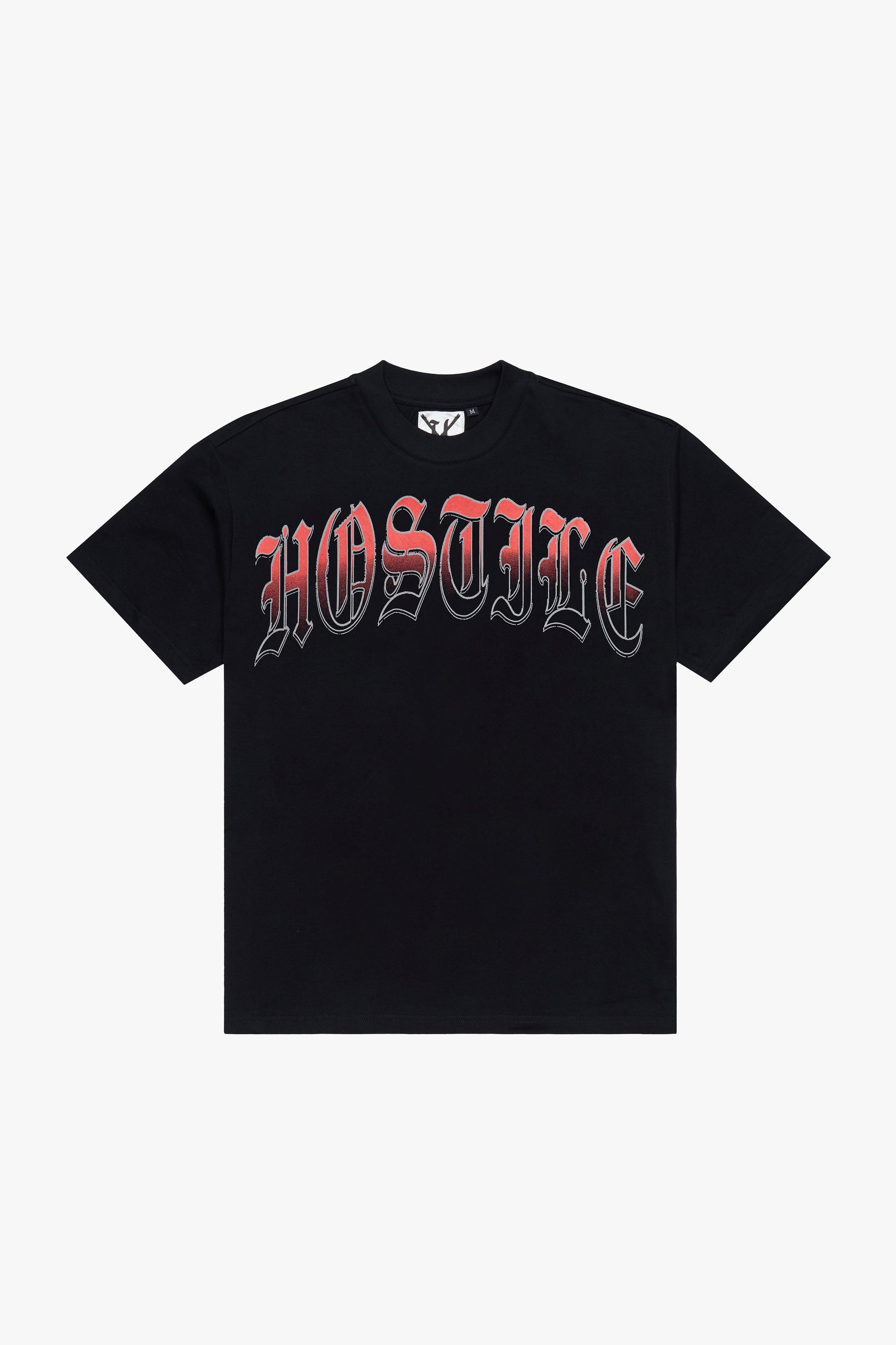 - Introducing the Death Knight T-Shirt in jet black, crafted from medium-weight cotton with a slightly oversized fit. It features a detailed skeletal knight graphic on the back with red accents and splatter effects. The front is finished with the HOSTILE logo in a matching red gradient.