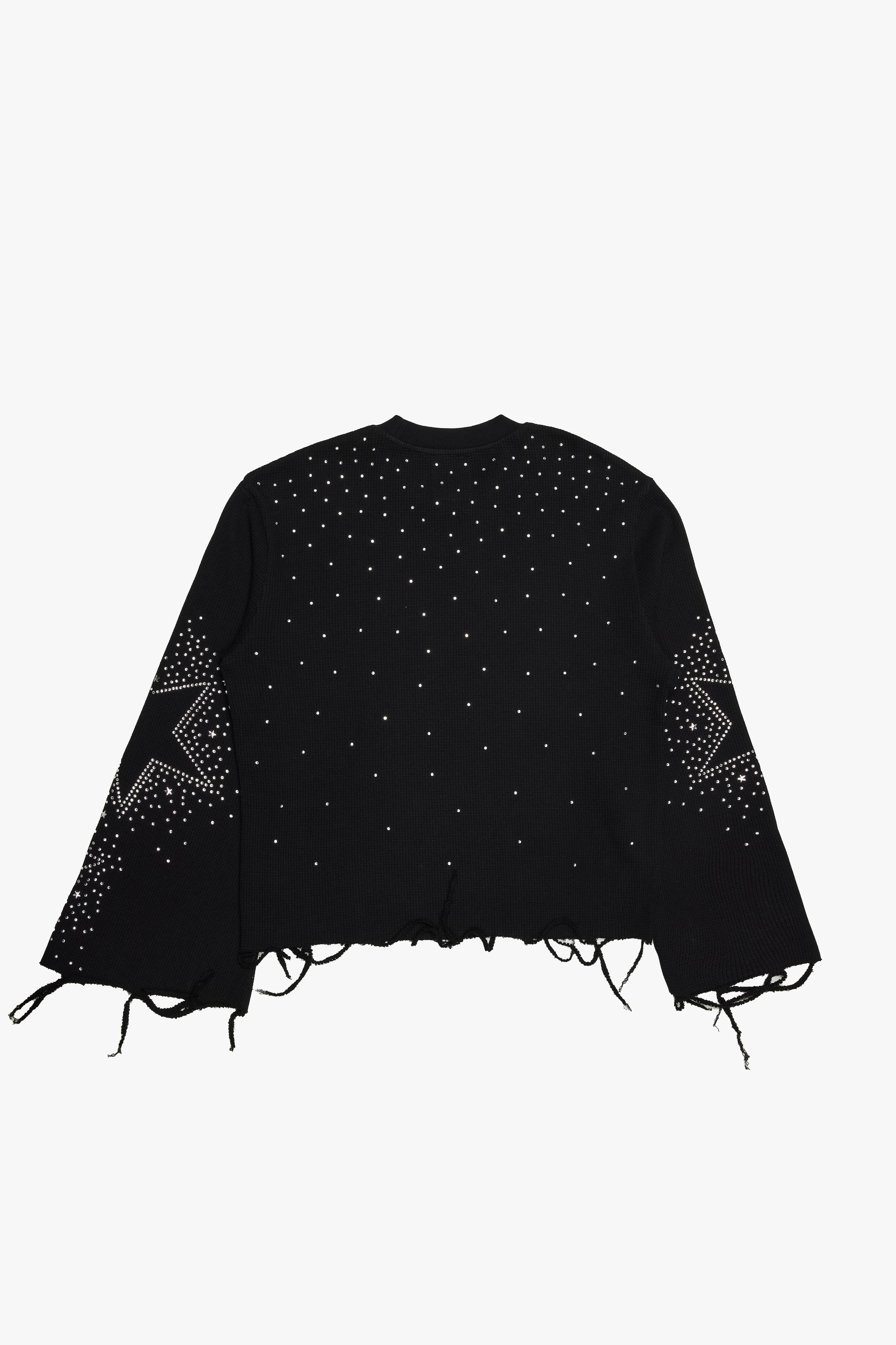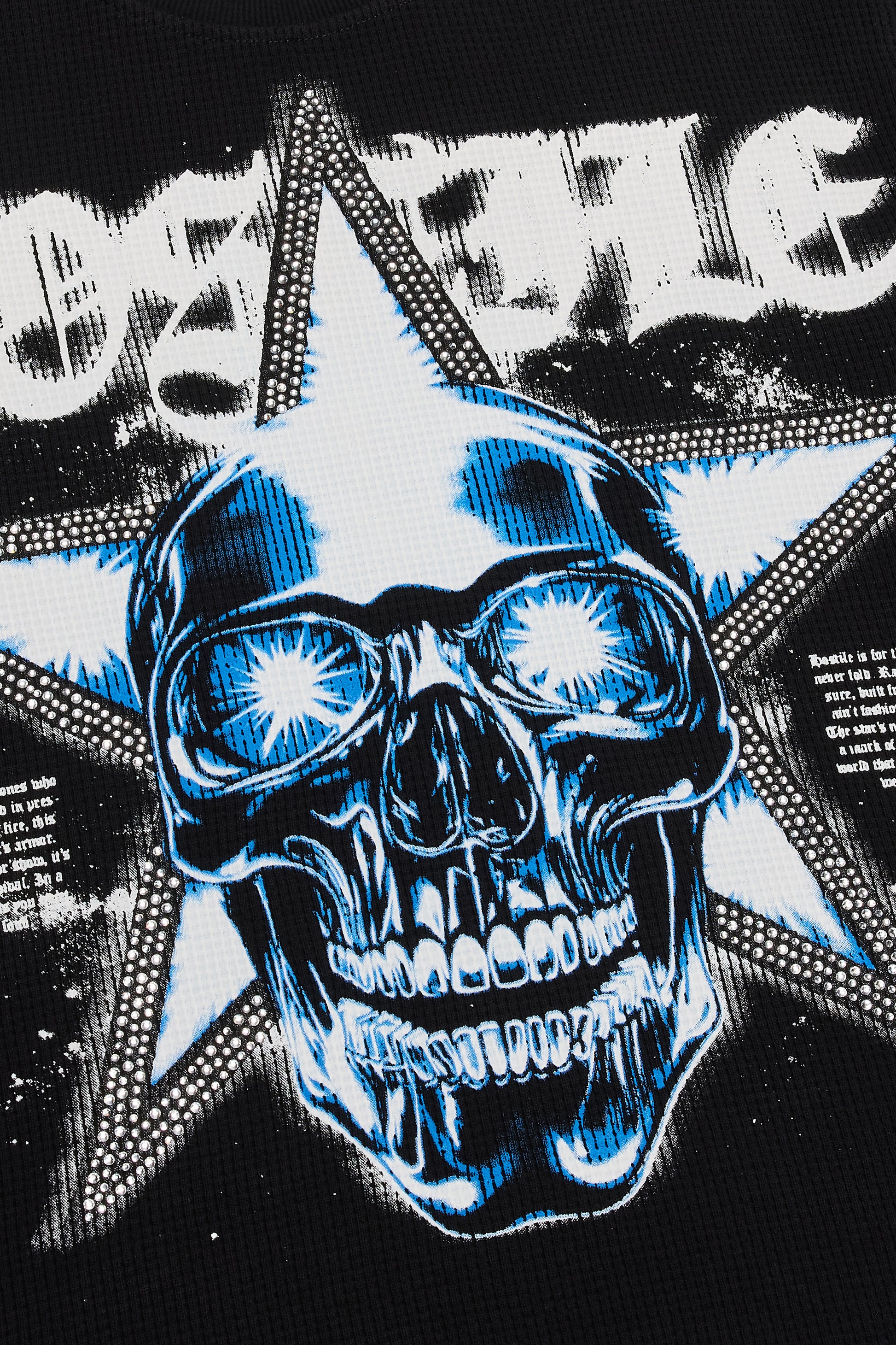 - Introducing the Skullstar Thermal in jet black, crafted from a soft, medium-weight waffle knit with a relaxed, cropped silhouette. It features our Skullstar graphic, with rhinestone stars along the sleeves and back, finished with a distressed look.
